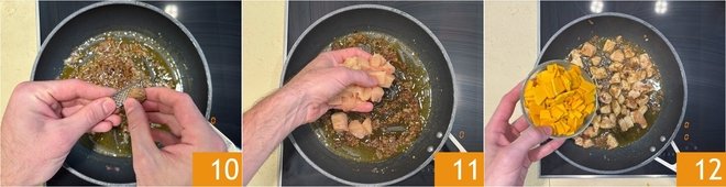Add freshly grated nutmeg 10. Stir carefully to distribute the flavors and toast the spices for about a minute: they should warm up and become fragrant without burning. Add the chicken cubes 11 to the pan and brown them well on all sides for about 5-7 minutes until golden. Move them only when they detach easily from the bottom: this way, you will get a golden crust that retains the juices. Now add the pumpkin cubes 12.