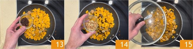 Also add the raisins 13, salt, pepper, and toasted nuts 14. Stir to mix everything, cover with a lid 15, and cook over medium-low heat for 15-20 minutes, stirring occasionally until the pumpkin is tender when pierced with a fork.