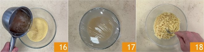 Meanwhile, prepare the couscous: put the couscous in a large bowl and pour over the broth that you have brought to a boil 16. Stir and cover with plastic wrap 17 or a lid. Let stand for about 5 minutes, or until the liquid is completely absorbed. Once the couscous has absorbed the broth, fluff it with a fork 18.