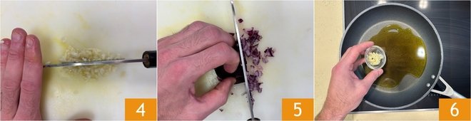 Peel the garlic and chop finely 4; do the same with the onion 5. In a large pan, heat a drizzle of olive oil over medium heat and add the garlic 6. Choose a pan wide enough to distribute the ingredients well: this way, you will avoid boiling them.