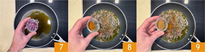 Add the onion 7 and sauté for 3-4 minutes, stirring occasionally. If you notice they are coloring too much, lower the heat slightly. Flavor with the spices: cumin 8, coriander, paprika, and cinnamon 9.