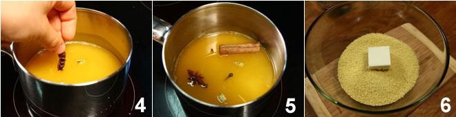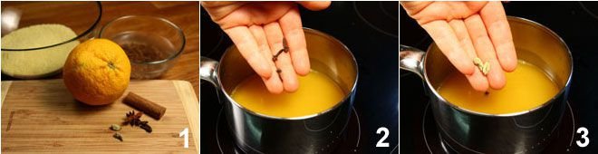 Pour the orange juice and water into a small pot, and add the cloves 2 and cardamom 3