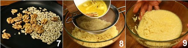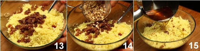 the raisins 13, and the chopped walnuts 14; heat the honey with a splash of water in the same pot until well dissolved and drizzle it 15 over the couscous and mix well; serve warm or even chilled in single-serving glasses or small bowls.