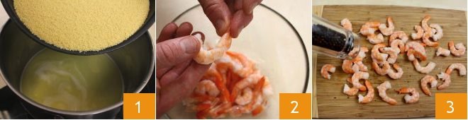 To prepare couscous with peas and shrimp, start by taking the couscous; in a pot, pour 1 cup of water, heat it, and add a good pinch of salt, two tablespoons of extra virgin olive oil, and the zest of one lemon. When the water starts to boil, add the couscous gradually 1, stir, then turn off the heat. Add the butter, level the couscous well with a spoon, and let it rest for 2 minutes so that the semolina absorbs the water. Shell the shrimp 2, removing the tails as well; season with salt and pepper 3