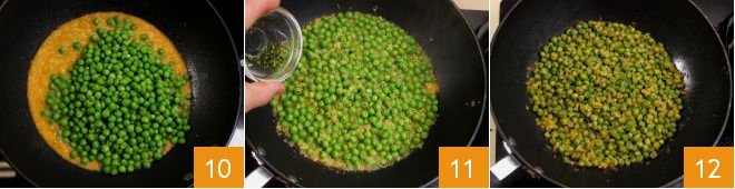 and continue to cook over low heat for 5 minutes. Add the peas 10, lightly salt and pepper 12. Add some of the chopped herbs to the peas 11 and cook for about 10 minutes until the peas are tender 12, adding a little water if they dry out too much.