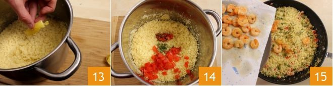 Meanwhile, remove the lemon zest from the couscous 13 and add the remaining chopped herbs and tomato cubes 14, mix and add everything to the peas, directly in the pan over low heat. Mix well, if necessary add a drizzle of extra virgin olive oil and finally add the shrimp 15. Turn off the heat, mix the couscous, and serve in small single-serving tagines, hot or cold as preferred.