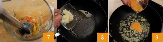 which you will blend together with a pinch of salt, one of pepper, a tablespoon of oil, and the zest of half a lemon 7; instead, cut the tomato slices into small cubes and set aside. Chop the thyme and marjoram and set them aside; finely chop the onion and sauté it in a pan with 2 tablespoons of olive oil 8; as soon as it starts sizzling, add the blended tomato juice 9