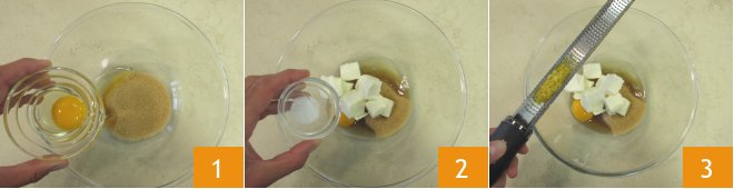To make the cream and plum tart, start with the shortcrust: in a bowl, add the brown sugar, medium egg 1, butter, salt 2, and lemon zest 3.