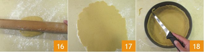 Roll out the shortcrust dough on a floured work surface 16, aiming for a thickness of about 1/5 inch 17. Carefully lay the rolled-out dough in a 9-inch springform pan, pressing it gently against the base and sides with your fingers (it doesn't matter if it's not perfect or symmetrical at this stage). Trim the excess to create an edge about 1 1/5 inches high 18.