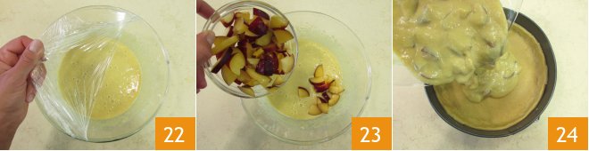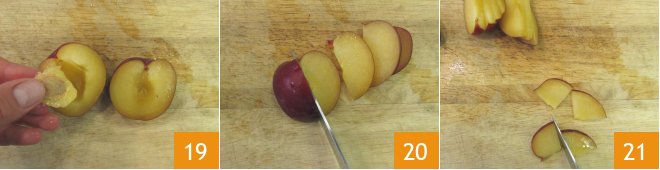 Cut the plums in half and remove the pits 19. Slice them thinly, about 1/6 inch thick 20, then set aside 5.3 oz of slices for decoration and cut the remaining 5.3 oz of slices in half 21 for the filling.