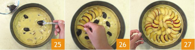 Using a teaspoon, add the plum jam 25. Arrange the reserved plum slices on the surface 26, creating a radial pattern 27.