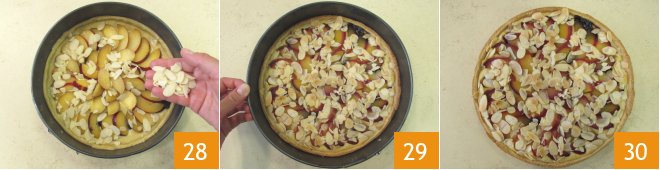 Garnish with sliced almonds 28. Bake in a static oven at 356°F, on the middle shelf, for 40 minutes. Then lower the oven temperature to 302°F and bake for another 30 minutes. Remove from the oven 29 and let cool thoroughly before removing from the pan. Decorate the edge with a little brown powdered sugar 30.