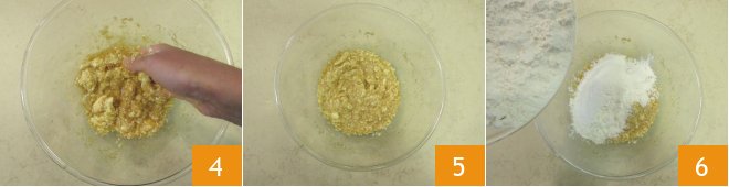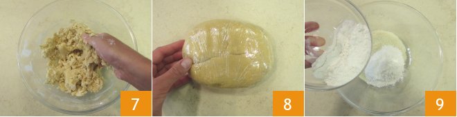 Quickly work the ingredients with your hands 4. You'll get a not entirely homogeneous mixture 5. Add the flour 6 and finish kneading with your hands.