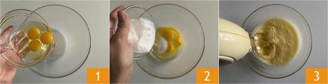 To prepare the cream cake, start by pouring the whole eggs 1 and sugar into a large bowl 2. Then beat with electric whisks until the eggs are pale, fluffy, and frothy 3.
