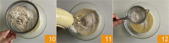 Now you can add the flour, making sure to sift it with a sieve 10. Once well combined 11, the last step is to add the sifted baking powder 12.
