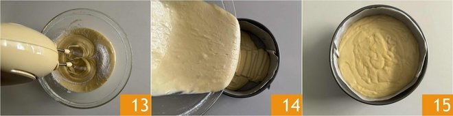 At this point, continue to mix with the electric whisks until you obtain a creamy and homogeneous mixture 13. Pour the mixture into a springform pan of 7-8 inches lined with parchment paper or greased and floured 14 15. Bake in a preheated static oven at 350°F in the middle rack for about 45 minutes. Times may vary depending on the oven, check the baking with a toothpick.
