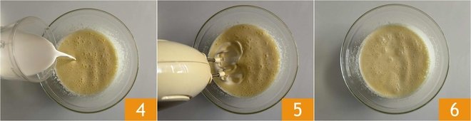 Next, add the fresh cream 4 and continue to beat with the electric whisks 5 to combine the mixture 6.