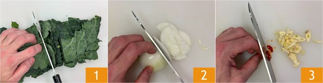 To make the cream of black cabbage and beans, first prepare the Vegetable broth and keep it warm. Clean the black cabbage and cut 300 g of leaves into strips 1. Peel and thinly slice the onion 2, then do the same with the garlic and chili 3.