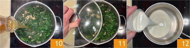 Cover with the hot vegetable broth 10 and bring to a boil, then lower the heat, cover with the lid 11, and cook for about 15-20 minutes. Meanwhile, prepare the fondue: pour the cream into a small saucepan 12 and heat it over low heat.