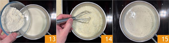 Once hot, turn off the heat and add the grated pecorino cheese 13. Mix well with a whisk to completely dissolve the cheese 14 and achieve a smooth and creamy consistency 15.