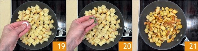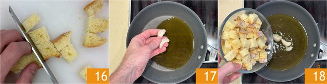 Move on to the croutons: cut the bread into cubes 16. In a pan, flavor a drizzle of oil with garlic cloves 17, then add the bread cubes 18.