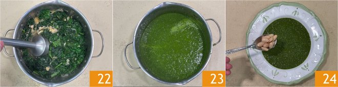 After the soup's cooking time, blend with an immersion blender 22 to achieve a smooth and creamy consistency 23. If it turns out too thick, you can thin it with a bit of broth; otherwise, you can keep it on the heat to slightly reduce it. Plate the cream and garnish with the reserved beans, which you have seasoned with a drizzle of oil 24.