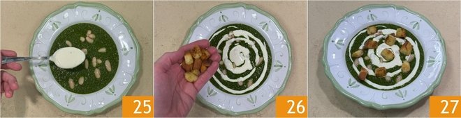 Finish with the pecorino fondue 25 and the crispy bread croutons 26. Your cream of black cabbage and beans is ready to be served 27!