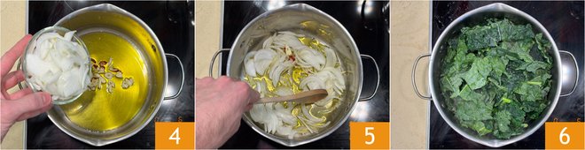 In a large pot, heat the oil with the garlic, chili, and onion 4 and let them sauté for about 5 minutes 5. When the onion has softened, add the black cabbage 6 and cook for another 5 minutes over medium heat, stirring often.