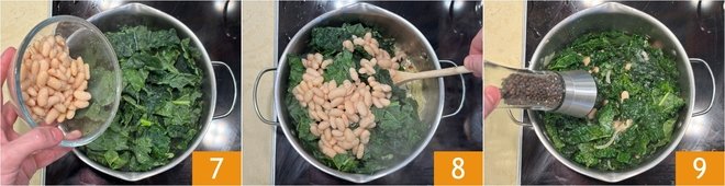 Now add the pre-cooked cannellini beans, keeping some aside for plating 7. Stir well 8, add salt and pepper 9.