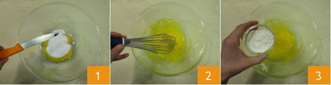 To prepare cream puffs, start with the custard. First, heat the milk in a saucepan. Meanwhile, in a bowl, pour the egg yolks, sugar, and vanilla seeds 1. Whisk together, then add the flour 3.