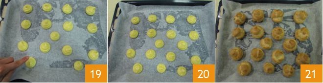 Using a finger or a slightly damp teaspoon, flatten the tips of the cream puffs 19 20. Bake the cream puffs in a preheated static oven for 15 minutes at 430°F, avoiding opening the oven during cooking. After the first 15 minutes, lower the temperature to 375°F and bake the choux pastry for another 10 minutes. Then turn off the oven and leave the cream puffs inside for another 10-15 minutes with the door slightly open (place a wooden spoon between the door and the oven); this will help dry the inside, then take them out of the oven 21.