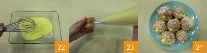 Take the custard from the fridge and whisk until smooth 22. Transfer the custard to a piping bag with a plain nozzle and use it to fill the cream puffs 23. Once you have filled them all, dust the surface with powdered sugar and serve your cream puffs 24.