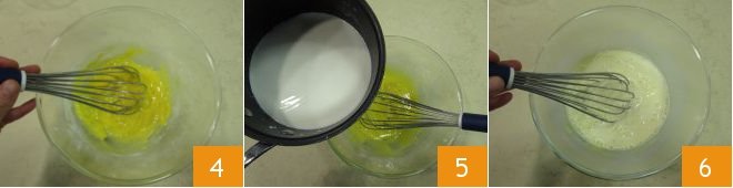 Whisk until you get a smooth and lump-free mixture 4. When the milk is almost boiling, pour it into the bowl 5 and mix everything with a whisk 6.