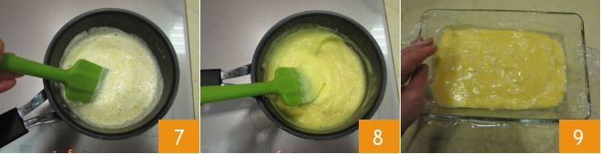 Transfer the mixture back into the saucepan and place it on the heat. Continue stirring with a spatula 7 until the custard thickens 8. At this point, transfer it to a bowl, cover with cling film in contact with the surface 9, and let it cool completely.