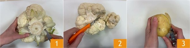 To prepare the cauliflower and turmeric soup, first clean the cauliflowers by removing the base and leaves 1; then divide it into florets 2. Peel the potatoes 3.