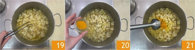 When the vegetables are cooked, remove the garlic and rosemary 19. Add the turmeric 20 and blend everything with an immersion blender 21.