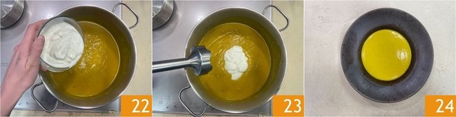 Once you have a smooth cream, incorporate the yogurt 22 and blend again 23. Serve 24.
