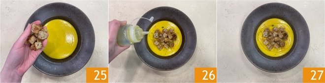 Finish with the crunchy croutons 25, a drizzle of oil 26, a pinch of paprika, and chopped rosemary 27.