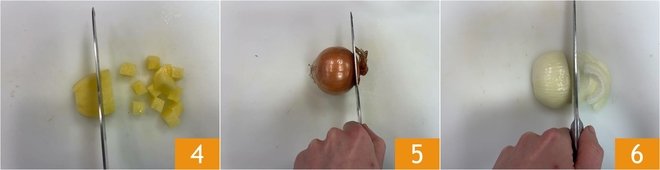 Cut them into cubes 4 and move on to the onion. Peel it 5 and slice it thinly 6.