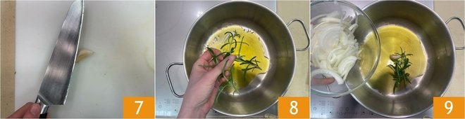 Crush the garlic cloves with the knife blade 7. In a large pot, heat a drizzle of olive oil over medium heat. Add the garlic, rosemary 8, and onion 9.