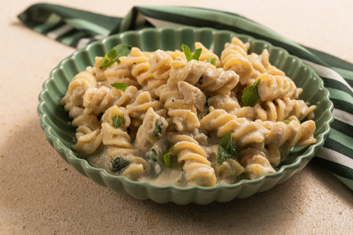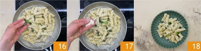Fragrantize with a few fresh mint leaves 16 and finish with grated Parmigiano Reggiano 17. Serve your creamy white eggplant pasta hot immediately 18!