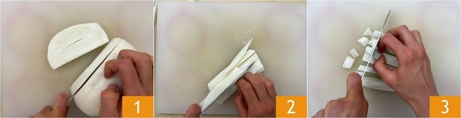To prepare the creamy white eggplant pasta, wash, trim and slice the eggplants 1, then cut them into sticks 2 and finally into even cubes about 3/8 in (≈1 cm) 3.