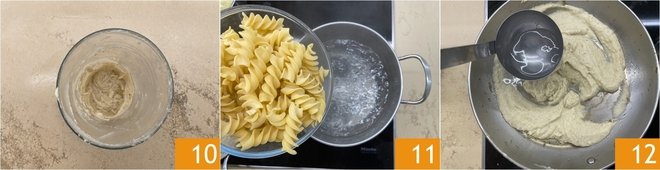 You should obtain a smooth cream 10. In the meantime, cook the pasta for the time indicated on the package 11. Transfer the cream to the skillet and loosen it with a ladleful of the pasta cooking water 12.