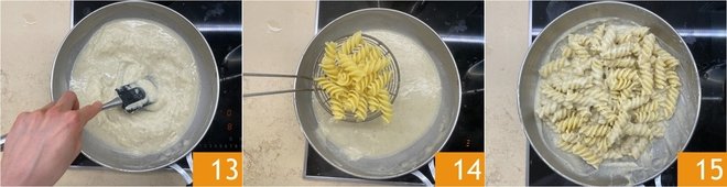 Stir to reach a fluid consistency 13. Drain the pasta al dente directly into the skillet 14, then mix thoroughly to coat and finish 15.