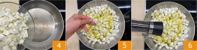 Transfer the eggplant cubes to a skillet 4, then add oil, salt 5 and pepper 6.