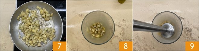 Cook over medium heat for about 10-15 minutes, or until the eggplants are soft 7. Meanwhile, set a pot filled with salted water on the stove and bring it to a boil. Once cooked, transfer the eggplants to a tall container 8 and blend them with an immersion blender together with a ladleful of the cooking water 9.