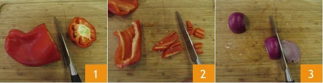 To prepare the bell pepper and burrata risotto, clean the bell pepper by removing the cap 1, the white filaments, and the internal seeds. Cut it first into slices and then into pieces; there is no need to be very precise 2. Peel and slice the onion as well 3.