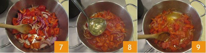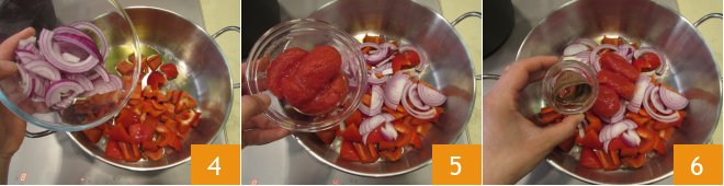 Pour a dash of oil into a saucepan and add the bell peppers, the onion 4, the peeled tomatoes 5, and the drained anchovies 6.