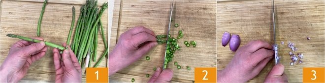 To prepare the creamy tubetti with peas, asparagus and pecorino, start by How to clean asparagus: remove the tougher bottom part of the stem 1 and slice the rest into rounds 2, keeping the tips slightly longer. Trim the shallot and chop it finely 3. In the meantime, heat some water or vegetable broth.