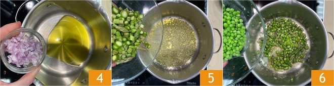 In a saucepan pour in the extra virgin olive oil, add the chopped shallot 4 and gently sweat it over low heat for 2–3 minutes, stirring often to prevent browning. Add the sliced asparagus 5 and the peas 6, then let them flavor for about 5–6 minutes, stirring occasionally.